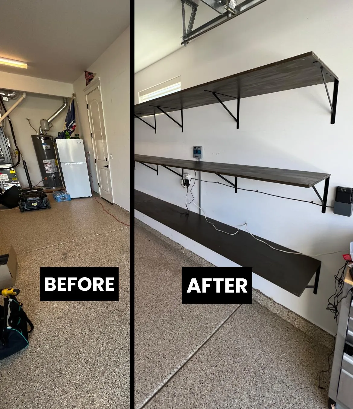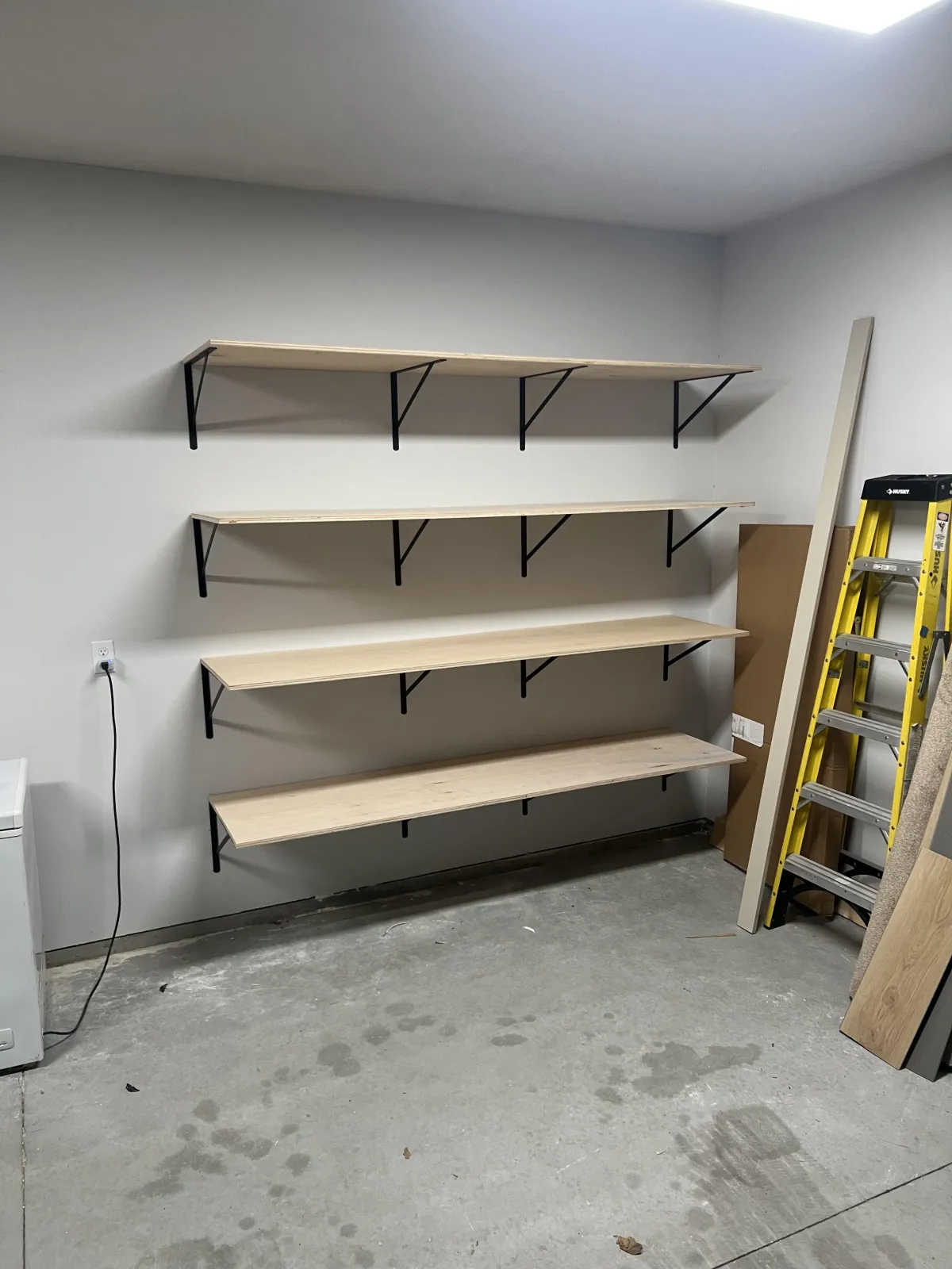 Stacey's floor, simple shelving, and slatwall.